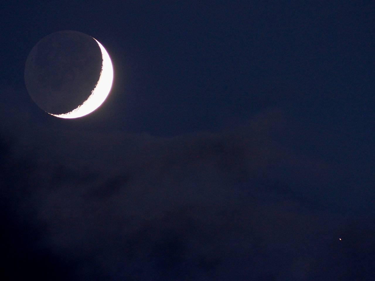 日が沈むと西の空の月の下に