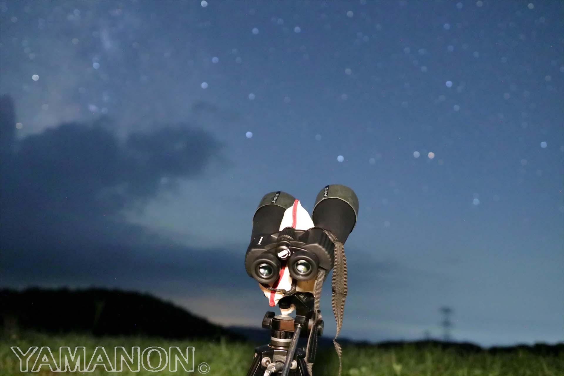 個人的に一番注目したのは実は本体質量が約1.5㎏。持った感じは50mmのアスコット(1,015g)と変わらなかった(ちなみに手持ちの限界が7×50あたり)。さすがに手持ちでは無理だけど、半固定で非常につかやすいバランスの取れたデザインだと思う。これに100均材料でカメラ用・双眼鏡用ビーンズバックを作って使用している。ビノシーカーは付属してるけど、固定した双眼鏡は地平近くは三脚固定でも不便はあまりないけど、中空以上は思うように振り回せないのでビーンズバックは有効な手段。特に三脚の一番の難点の天頂付近を見るのに重宝する。双眼鏡で寝転んで天頂付近を見る時に、見口(目に)に行ってた重みが顎あたりに分散できたり(目や眼鏡に重圧がかかるのでオススメはしない使い方)。双眼鏡に挟んで三脚と併用して見ると楽(ビーンズバックにカメラ台座を接着して三脚につけられるようにして、見るときは三脚を抱く感じで天頂付近を見る)。