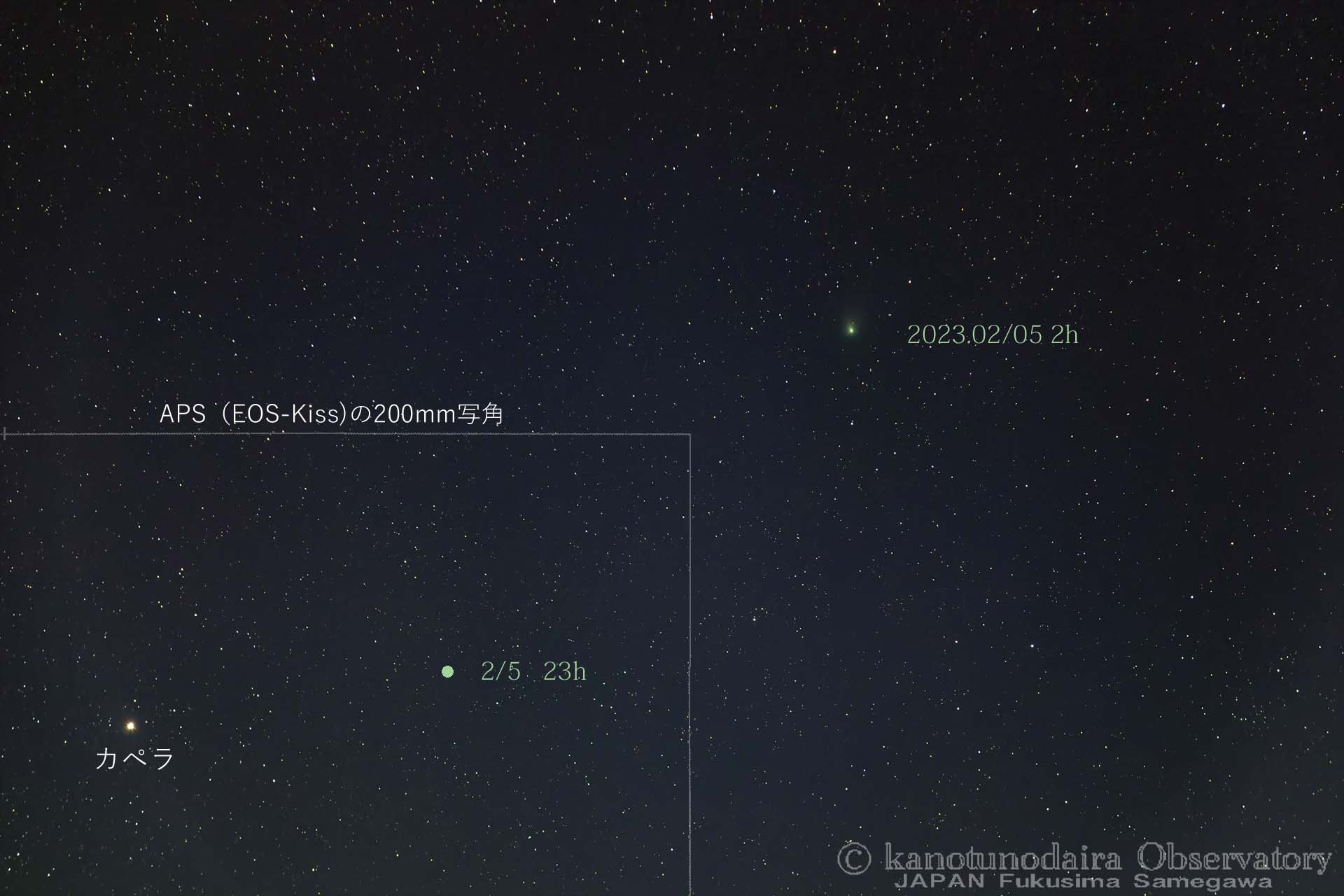 8cm双眼で光芒。13cm反射でも核の見える光芒であまり変わらず。5cm双眼だと、彗星状天体を見たことない人はまず見逃す淡さ。今日(2/5)はカペラの近く(7°視野内)だからじっくりみればわかるはず。このあと11日に火星に接近するので、今週はカペラと火星を入れて撮れば撮影は見るのよりは楽勝。見るのはカペラから火星に向かって視野を動かせば見つかるはず。