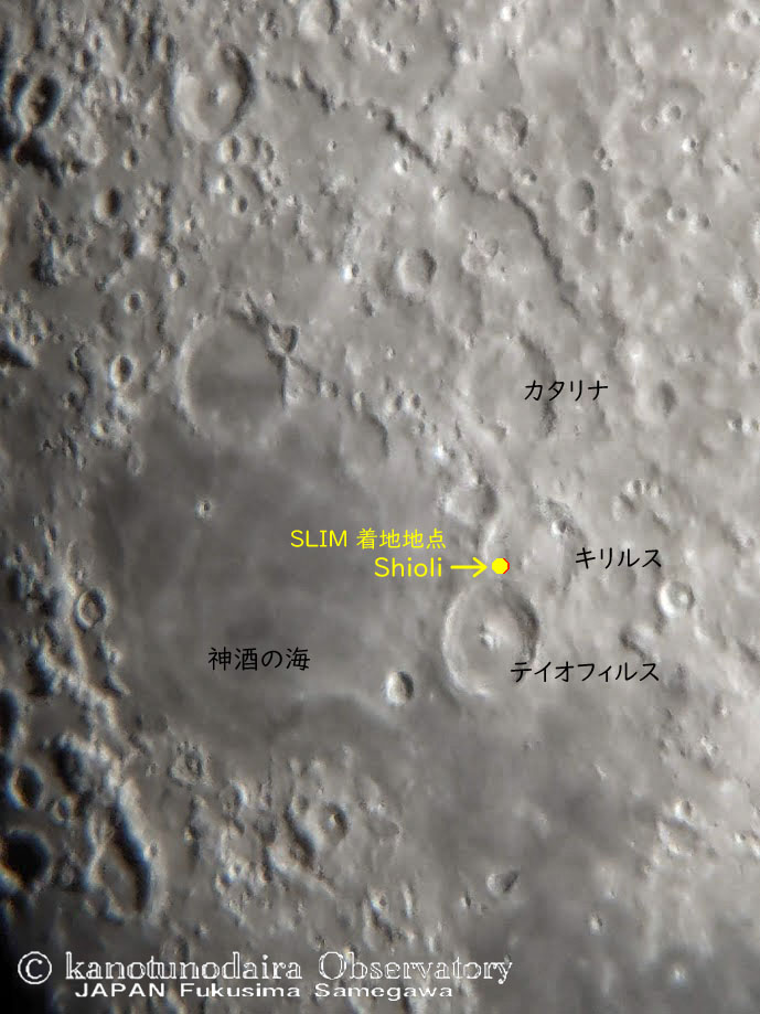 いま日本で一番注目されている神酒の海のクレータ列の真ん中キリルス。たぶん多くの天文ファンが望遠鏡を向けてる小型月着陸実証機SLIM着地地点。小口径じゃシオリクレーターも見れないけどこの辺にSLIMが居る。
