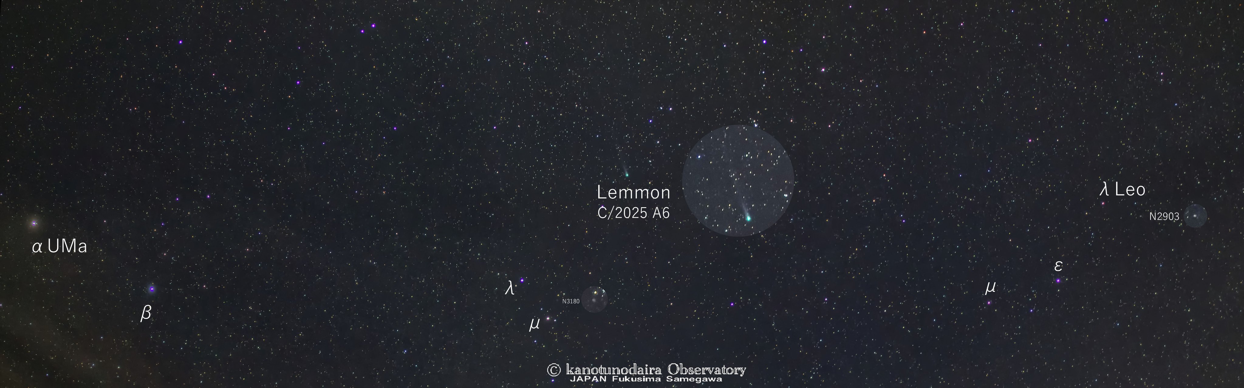 北斗の枡先(α/β)から後足(前)をたどると双眼鏡でも見えた。15×70で尾は見えないが(薄明中だからか?)明るい丸い光芒ですぐ彗星だとわかった。7×50あたりだと滲んだ恒星状で見慣れてないと彗星だと思わないかも? 近くに比較天体がなかったので獅子の鼻先銀河(8.9等)まで入れてみたいけど比べ物にならないほど明るい。球状星団のようなイメージ(ちなみにM3球状星団には10/20に接近。尾が星団と反対側なのがおしい(^^;)